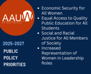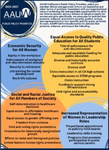 AAUW California’s Public Policy Priorities, which are member-driven and approved, inform our legislative and other forms of activism. Consistent with our organizational value of achieving fair and equitable opportunities for all in our diverse society, and our mission to advance equity for women and girls specifically, we advocate for policies that promote, enhance, and ensure security, justice, access, and representation in four specific priority areas: economic security for all women; equal access to quality public education for all students; social and racial justice for all members of society; and increased representation of women in leadership roles.